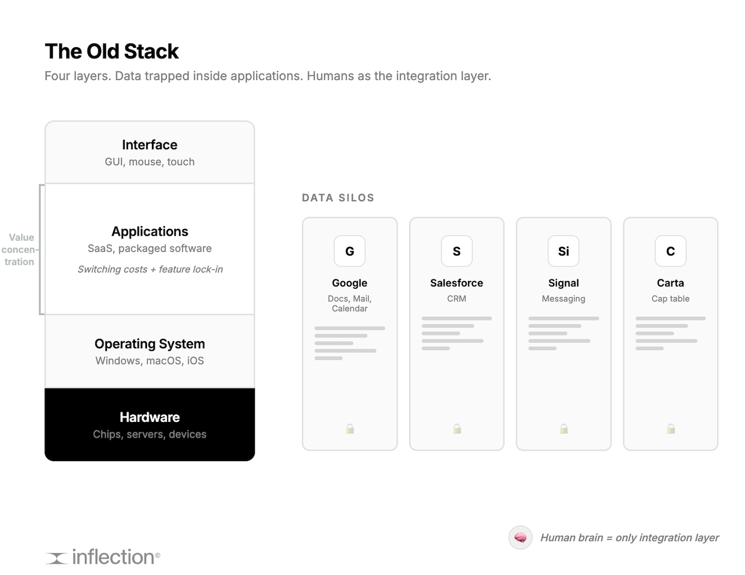 The human brain was the only integration layer. We were the ones copying data between applications, context-switching between fifteen tabs, manually synthesizing information scattered across silos. The applications didn’t talk to each other. We did the talking for them.