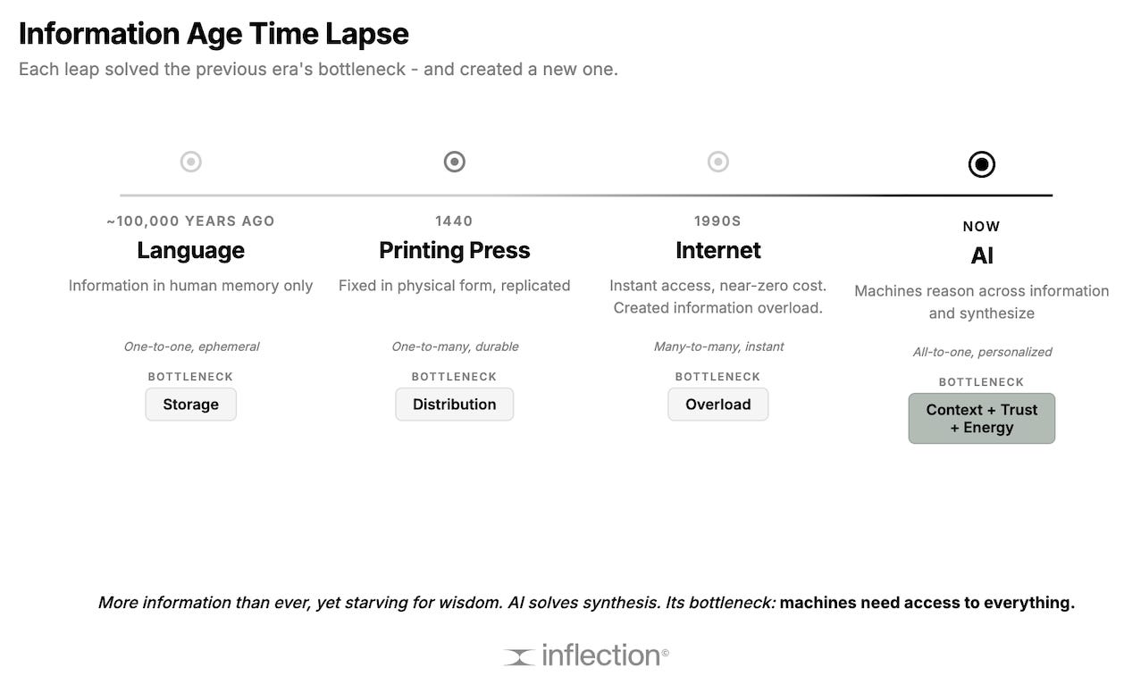 Each leap solved the previous era’s bottleneck but created a new one. Printing solved storage. The internet solved distribution but drowned us in noise. AI solves synthesis. But has several bottlenecks. The most imminent is context: to reason, machines need access to everything.