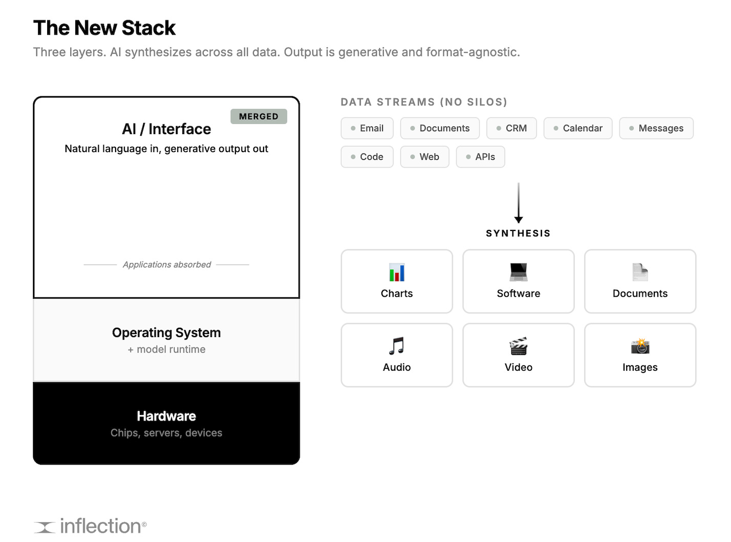 Hardware remains at the base - unchanged, still the physics constraint. Operating system still manages resources but now includes the model runtime. AI and interface merge into a single layer. The AI is simultaneously the reasoning engine and the interface. Natural language in, generative output out.
