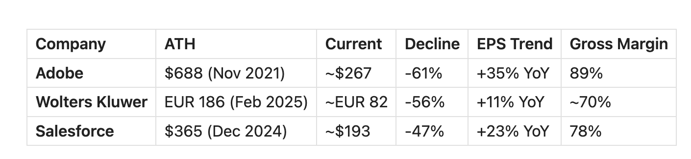 The paradox is striking. Earnings are growing. Margins are stable or expanding. Yet stocks are cratering. Markets are repricing the terminal value of software moats. Current earnings are fine - but future earnings are worth less because the moat is dissolving.